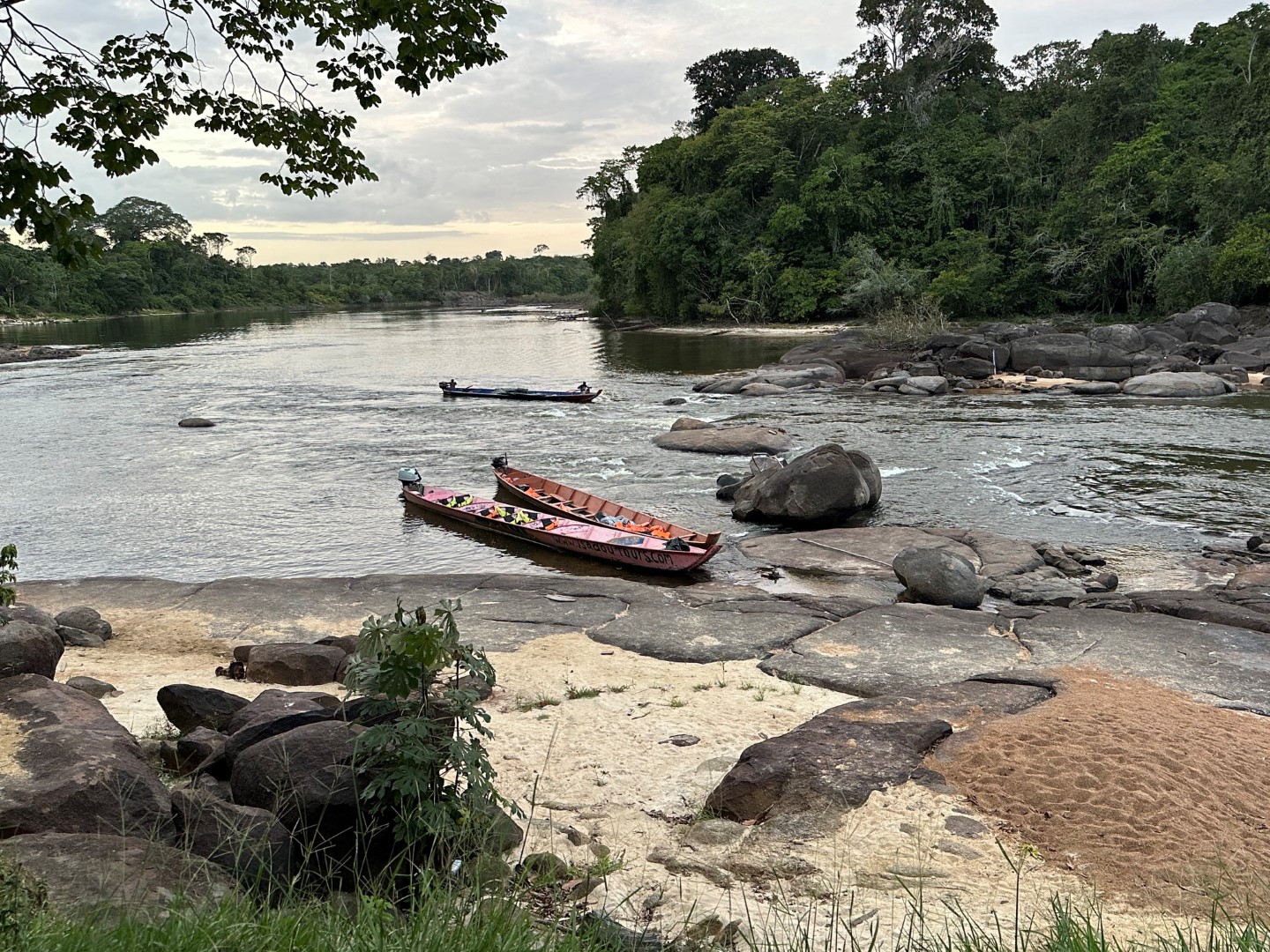 We set out from the Alex II bright and early on a 3 hour bus ride to a place called Isadou. We then got in long motorized canoes and traveled 40 minutes upstream to a lovely little establishment deep in the jungle. We spent our afternoon frolicking in the river and eating delicious food. As I’m writing this, half our group is on a cayman observation trip downriver in the dark of night, looking out for glowing red eyes. I think I can speak for all of us when I say we are all stoked to get a break from life onboard and classes, especially with exams coming up.