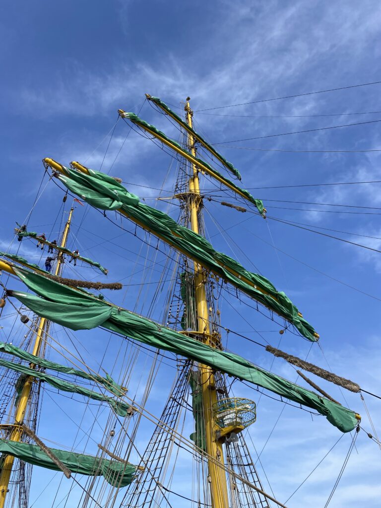 Oscar, unser Smut, ein Mann mit markantem Gesicht, Bart und zurückgebundenem Kopftuch macht den Eindruck, als wäre er aus einem Piratenfilm entsprungen. Doch der Schein trügt – dies ist der beste Schiffskoch, den die Welt je gesehen hat! Er steht bereits um 3.30 Uhr auf und backt selbst die Brötchen und das leckere Brot für´s Frühstück. Wie ich erfahre, ist er gelernter Konditor und kann diesen Beruf allerdings wegen einer Mehlallergie nicht mehr ausüben. Für die Besatzung der Alex 2 ein Segen! Schon duftet das ganze Schiff nach Kaffee und wir werden über Bordlautsprecher mit dem Lied „Jede Zelle meines Körpers ist glücklich…“ aus dem Tiefschlaf gerufen. Nach dem leckeren Frühstück gibt es zunächst eine Sicherheitseinweisung mit Rettungsweste und Bordbegehung. Danach wird der Anker gelichtet und wir werden in die Künste der christlichen Seefahrt eingewiesen. Dies geschieht in drei Wachen, die über Tag und Nacht verteilt sind und sich alle 4 Stunden abwechseln. Ich gehöre zur 4-8-Wache und mein Toppsi ist Sternie, ein humorvoller und immer entspannter Mann, der mit sehr viel Charme und Geduld das Team anweist und die Begriffe und Zusammenhänge der Seile, Segel und Rahen erklärt. Ich verstehe am Anfang nur Bahnhof bei den ganzen Fachausdrücken und mache mich in den Pausen anhand des Bordhandbuches schlau, damit ich Gordinge nicht für Fischbrötchen halte und Bram Royal nicht mit einem Longdrink verwechsele. Als das Schiff dann Fahrt aufnimmt und ich durch die grünen Segel in den blauen Himmel schaue, merke ich, dass das Virus mich gepackt hat. Vielleicht haben die mir heimlich davon etwas in die Thermoskanne getan?
