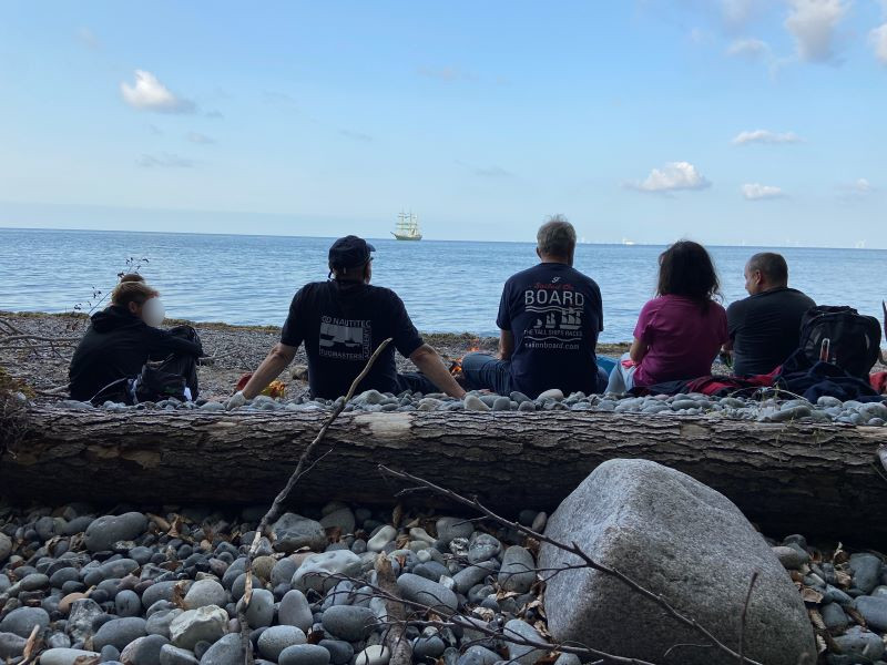 Der Abend gestern war ein unvergessliches Erlebnis. Nach dem Abendessen um 18:15 Uhr legte das erste Shuttle-Boot Richtung Küste ab. Im Halbstunden-Takt kamen neue Besatzungsmitglieder von der ALEX an den Strand gefahren. Einige sammelten trockenes Holz am Strand. Andere gingen schwimmen. Andreas, unser Feuermeister, entzündete dann das Holz in einer mitgebrachten Feuerschale. Als wir eine richtige schöne Glut und auch Feuer hatten, grillten wir Rindwürstchen auf einem mitgebrachten Grillrost. Wir sammelten kleine Stöckchen, säuberten diese mit Taschenmessern und klebten Stockbrot-Teig daran, das uns unsere beiden Smutjes vorbereitet hatten. Das Stockbrot war köstlich. Der eine oder andere füllte das Loch des Stockbrots mit Nutella. Es ist auch eine Kreation mit geschmolzenen Gummibärchen gesehen worden. Musikalische Begleitung hatten wir auch. Wolfgang spielte Gitarre und Doc Axel auf dem Schifferklavier. So konnte der eine oder andere beobachtet werden, der mitsang, mancher leiser, andere lauter. Einige schunkelten. Ich habe den Eindruck, es war für alle etwas dabei und alle hatten ihren Spaß. Und auf der Rückfahrt strahlte die Alex hell erleuchtet – was für ein Bild. Hach, ich komme ins Schwärmen.