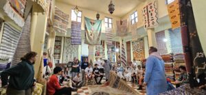 We left our desert glamp camp the way we came: by camel. While we were trekking through the desert, something rare happened: big fat drops of rain started falling. We got rained on in the Sahara! Later in the day, we stopped by a carpet-making co-operative and learned how the women of the community make carpets by hand from shorn wool to finished product.