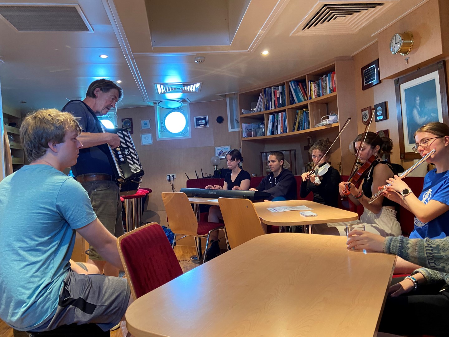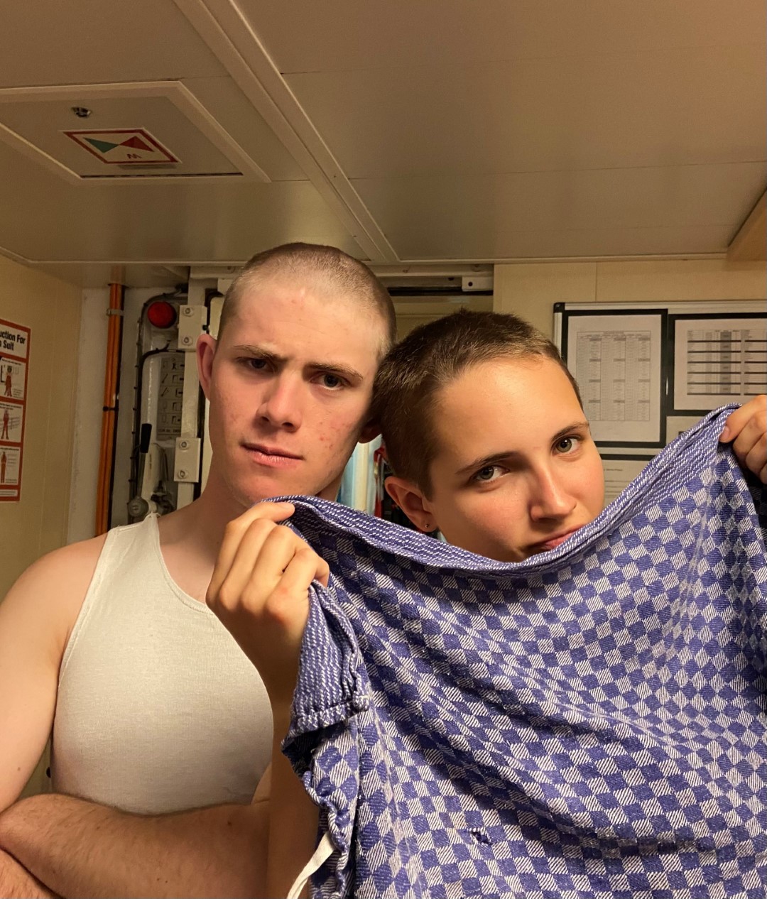 We started out with some smooth sunny sailing and a hardy breakfast! Around midday we passed by more Canary Islands and received connection for our phones. The shouts of excitement about this news could be heard around the boat. Speaking of on deck…A few of our floaties got cool new haircuts up on deck! Then the ship orchestra lead by Tom practiced some of their sea shanties. They sounded amazing! All the hard work left them and a definitely a few others hungry for snack which thanks to the cooks we had some yummy apple cake! Another wonderful surprise of the day was the gorgeous sunset. We ended the day with a yummy chicken dinner. Well it didn’t end for all of us…. Watches must go on! -Anya