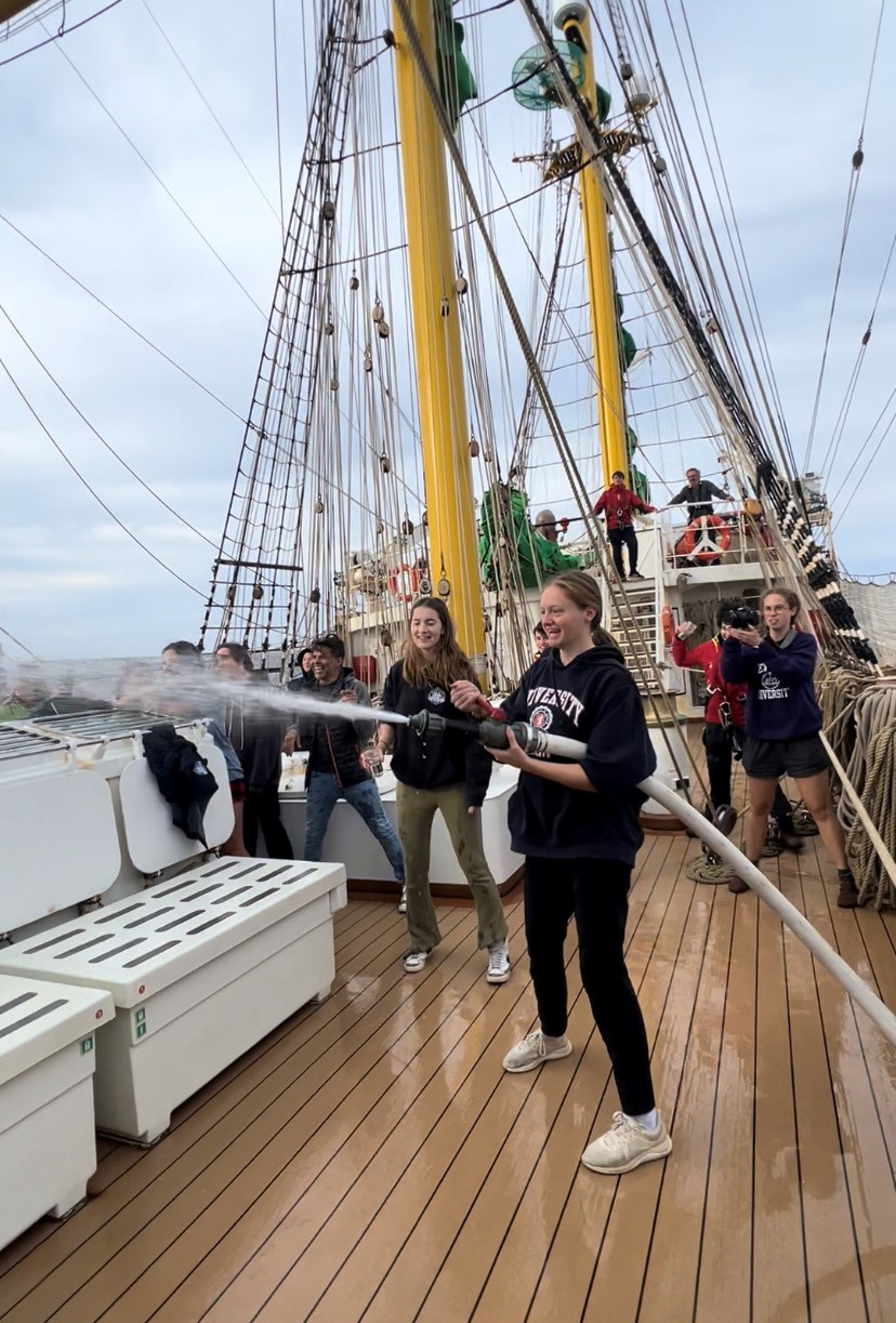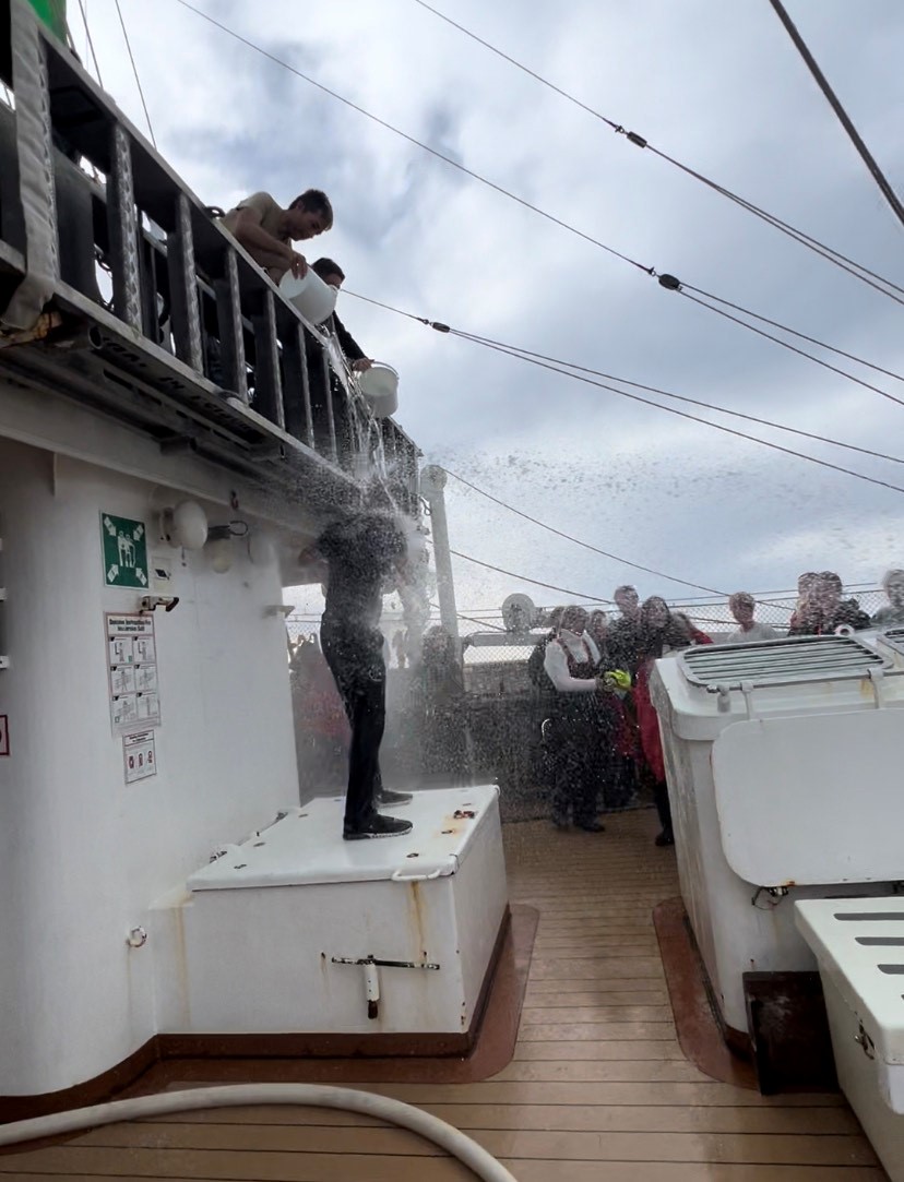 It began like any other day with me waking up and staring at the ocean through the porthole for a while before getting up to have my morning meeting with the Captain. All was well on the good ship Alex-2 and the winds are fair enough to blow us into Ponta Delgada in good time. We made plans for the deep ship clean and separated the non-Schengen passports for immigration. Then… breakfast. Then… colours. Our rota means we run colours once every 55 days, so quite the treat. After colours… uh oh. The tradition is a drenching. It’s usually buckets – 5 or 6. At least ten were lined up and a tray of plastic cups had been arranged for that personal touch. As if that wasn’t bad enough, Kailey was loitering in the shadows beneath the stairs to the foredeck with the firehose.