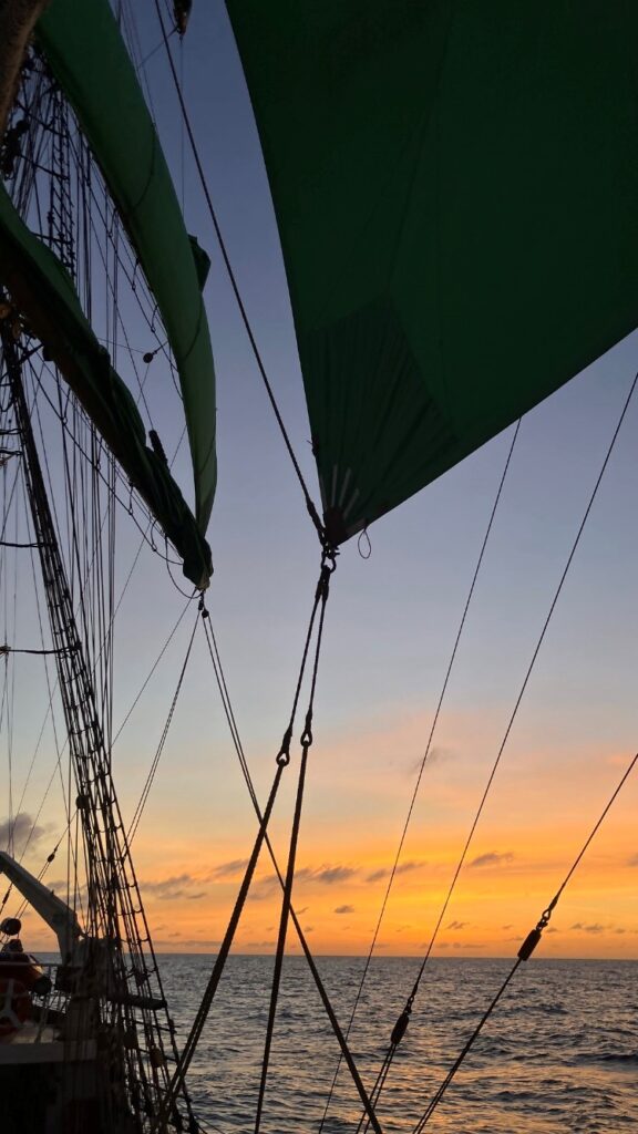 It is day 4 of the Atlantic Crossing and things are going very well. Floaties have been very busy with school and watches as normal, but there are other activities going on as well. Some students are still competing in the chess tournament, lots of Watch movies, on deck conversations, and a good game of Assasins which is a game where you have to “kill” a floatie by handing them an object. The sails are up and winds are picking up which is great when you are on a tall ship; overall it was a really good day.
