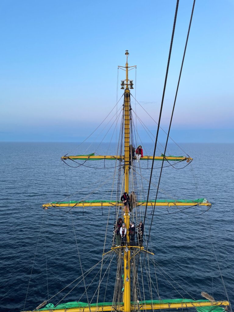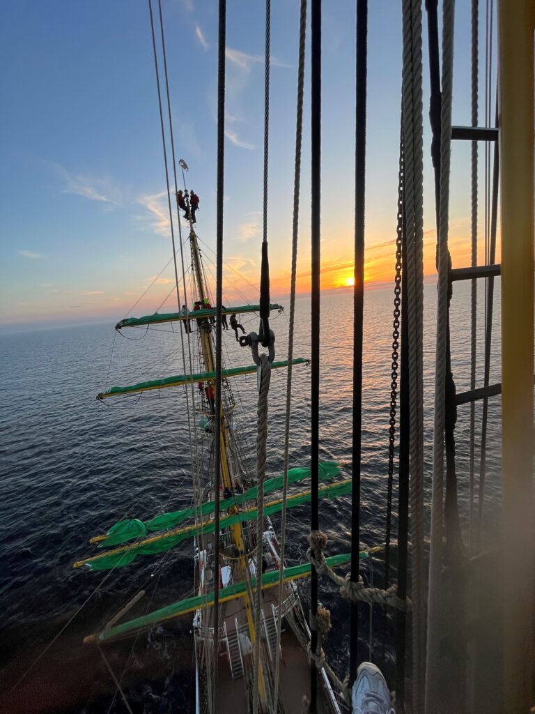 Today was our last full sailing day; tomorrow we will drop the anchor and be in Germany soon. Students enjoyed the service on deck between classes and many students climbed up the rigging to watch the sunset while we sailed for the final time. Finally, we bonded in our last night watch of Class Afloat. – Emmy