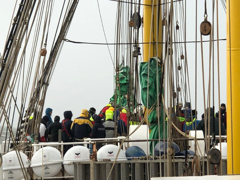 Das Wetter hat heute allerdings auch bei einer weiteren Übung, „Bergung aus dem Klüver“, ordentlich Wind gemacht – wortwörtlich, denn die Rettung des Freiwilligen, der sich schon voller Tatendrang unter einigen Segeln verkeilt hatte, um nicht wegzuwehen, wurde abgebrochen. Grund: Hagel.