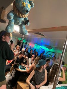 Yesterday was Halloween! We woke up to decorated halls and a ghost scavenger hunt in the mess. The rules: take Lauren a ghost from the mess and receive a candy. The sailing day was choppy but beautiful. Classes continued as usual, but the night turned spooky! Most students dressed in spontaneous or devilishly planned costumes. Lauren, Kayley, and Lea planned a karaoke night and the maritime crew and backdraft helped to decorate. We entered the mess at 7:30pm and gathered to hear some spooky, funny, loud karaoke. The party ended at 8:45pm. Happy Halloween! 🙂 – Scarlett