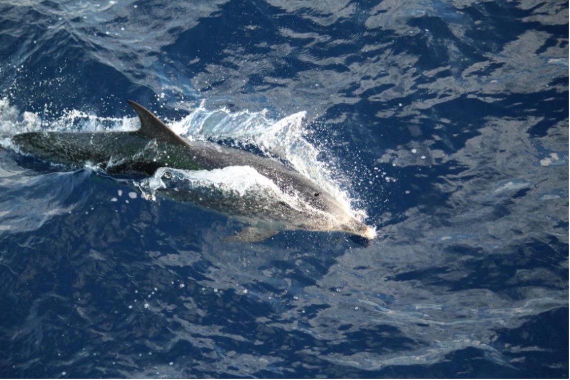 Watch 1 got to watch “Oscar” the dummy (pictured) get rescued by our crew after “losing consciousness” in the rigging- whilst other Watches got to participate in the rescue of a “box over board”. Also pictured is a photo of a Pan Tropical Spotted Dolphin that followed the boat for a while!