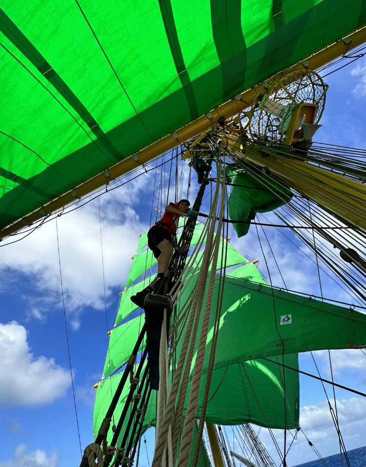 Today our dear floaties continued on their way to Suriname, being the 5th day crossing the Atlantic. Great winds and a beautiful climate let the floaties continue with their sail training to become Ordinary Seamen. To end the day, mother nature gave the Alex II a beautiful sunset.