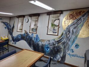 An der Pier lag hinter uns ein umgebauter Fischkutter einer Organisation, die Aktionen gegen Walfang macht: Mit kleinen schnellen Booten versuchen sie die Walfänger zu behindern und so zu verhindern, dass Wale getötet werden. Die Crew besteht hauptsächlich aus Freiwilligen und lud uns nachmittags ein, ihr Schiff zu besichtigen. Wir freuten uns auch über ihren Gegenbesuch und zeigten ihnen gerne unser Schiff. Ihr Maschinenraum ist im Vergleich zu unserem riesengroß, aber unsere „Hauptmaschine“ befindet sich ja auch an Deck und ist grün…