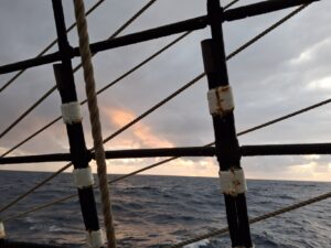 nach einer ruhigen Nacht unter Segeln fuhr die 8-12 Wache mit UnterstĂŒtzung von Freiwilligen um 9:45 eine Halse und weilâs so schön war, um 11:05 noch eine. Dann war um 13:30 die 0-4-Wache mit ihrer Halse dran. GestĂ€rkt mit leckerem Apfelkuchen ging dann um 16:30 Uhr die 4-8-Wache zusammen mit Freiwilligen an die nĂ€chste Halse und schloss dann den Segeltag um 19:10 mit einer Dinner-Halse ab. Die Trainees finden sich inzwischen immer besser mit den vielen Tampen zurecht, sodass Conrad mit den Segelmanövern zufrieden war.