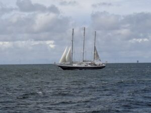 Unser Kapitän Joachim übergab das Ruder an unseren neuen Kapitän Richard. Ursprünglich geplant wollten wir erst morgen früh auslaufen, entsprechend hatte die Crew heute Landgang. Einige bummelten durch Scheveningen, während andere in die nahegelegene Altstadt von Den Haag zogen und im Kunstmuseum Mauritshuis das berühmte Vermeer-Gemälde „Das Mädchen mit dem Perlenohrring“ bewunderten. Da sich für morgen früh aber ungünstiger Wind ankündigte, beschloss Kapitän Richard, schon heute um 14 Uhr auszulaufen. Dank der modernen Kommunikationsmedien hatten wir um 13 Uhr alle Crew-Mitglieder wieder an Bord und konnten pünktlich ablegen.